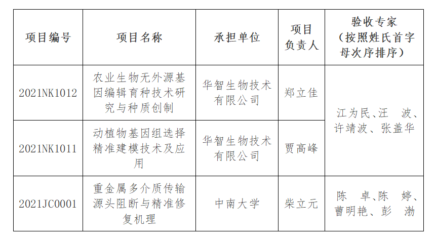 根据《湖南省科技创新计划项目验收管理工作规范》(湘科计〔2020〕29号)有关规定,省科技事务中心于4月23日组织专家对2021年立项的种业创新和自然科学基金重大项目(揭榜制)开展现场综合验收工作。按照评审公开、公正、公平原则,现将验收专家名单予以公示: