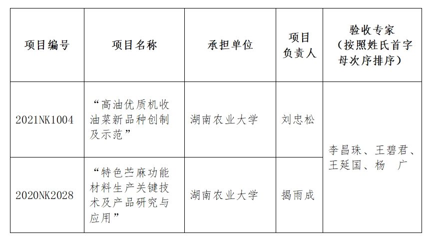 根据《湖南省科技创新计划项目验收管理工作规范》(湘科计〔2020〕29号)有关规定,省科技事务中心于4月18日组织专家对2020年立项的农业领域重点研发和2021年立项的种业创新项目开展现场综合验收工作。按照评审公开、公正、公平原则,现将验收专家名单予以公示: