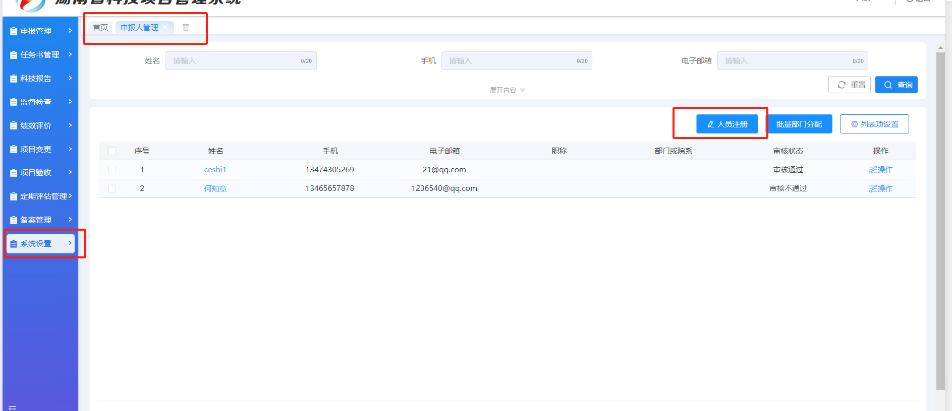 A: 使用单位管理员账号登录科技云系统,点击科技服务【科技项目管理系统】- 进入后点击左侧【系统设置】-【申报人管理】-点击【人员注册】按钮,输入申报人信息点击提交即可。