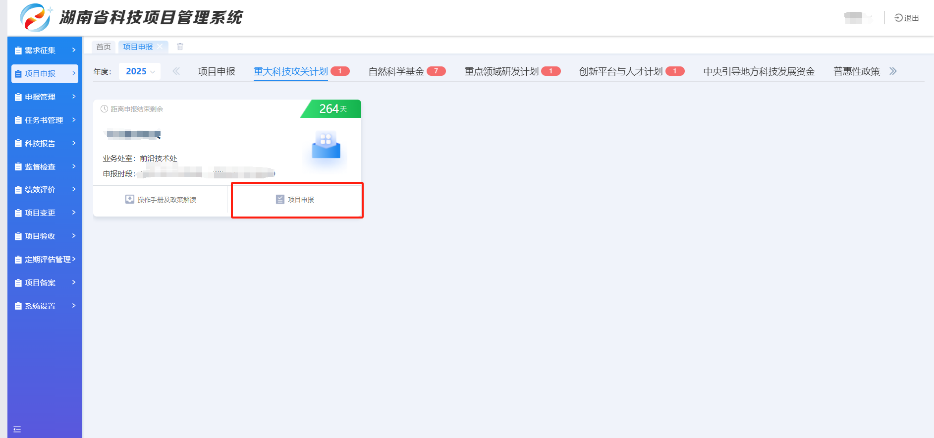 4. 第四种方式:个人账号登录“湖南科技云平台-科技项目管理系统”,使用菜单“项目申报-项目申报”选择具体项目类别进行申报。