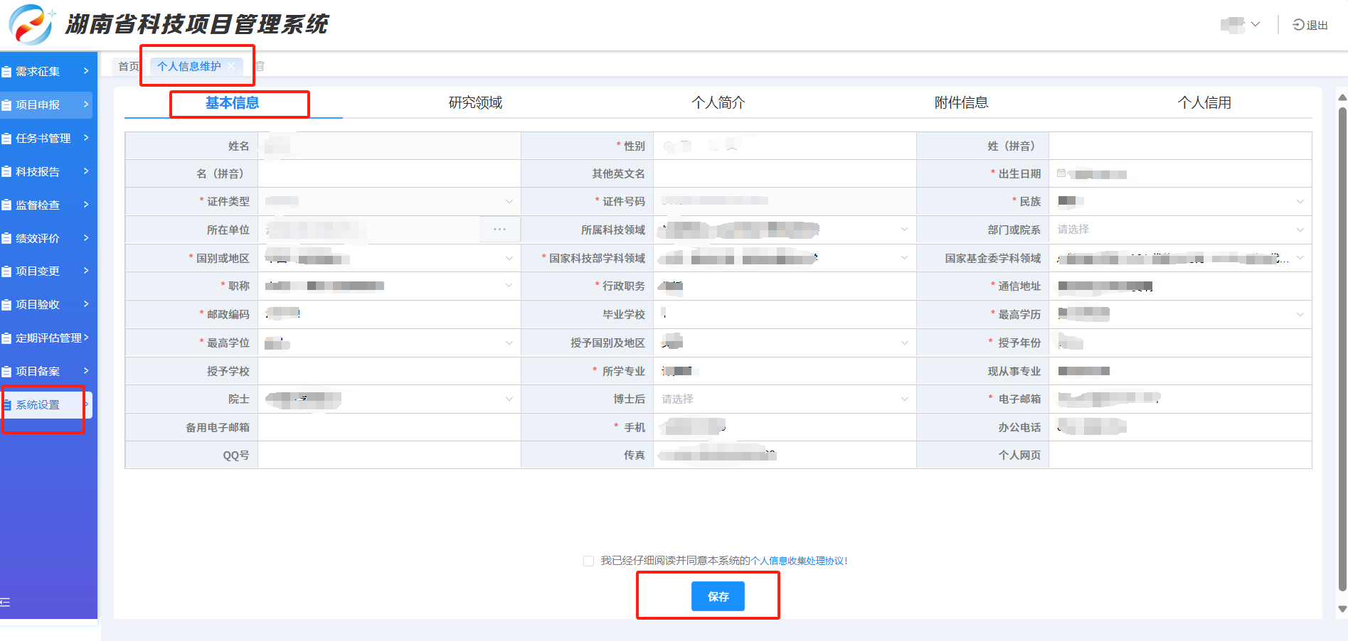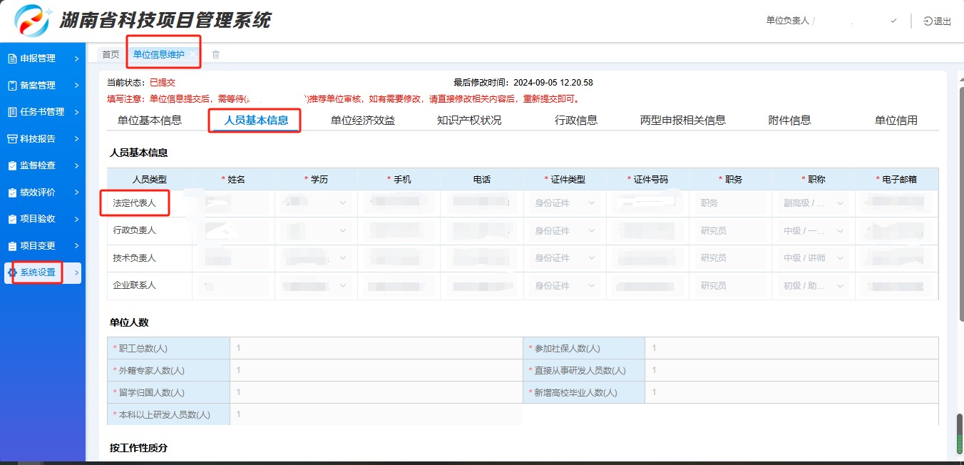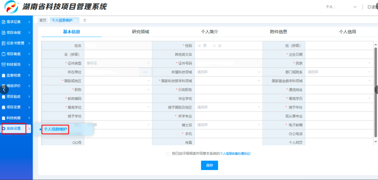 A:项目负责人登录科技云平台,进入系统设置中个人信息维护页面进行填写和更新