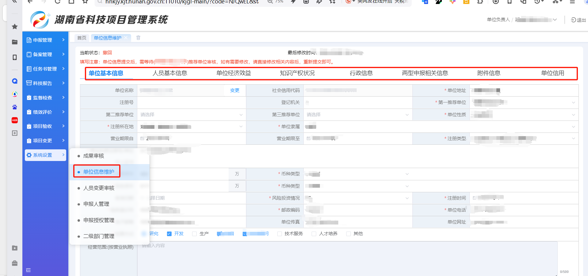 A:使用"单位管理员(法人)账号"选择法人登录,成功登入系统后,进入"科技项目管理系统" → "系统设置" → "单位信息维护" → 修改相关信息 → "点击提交" → 联系推荐单位审核单位信息,推荐单位审核通过后重新进入表单即可。