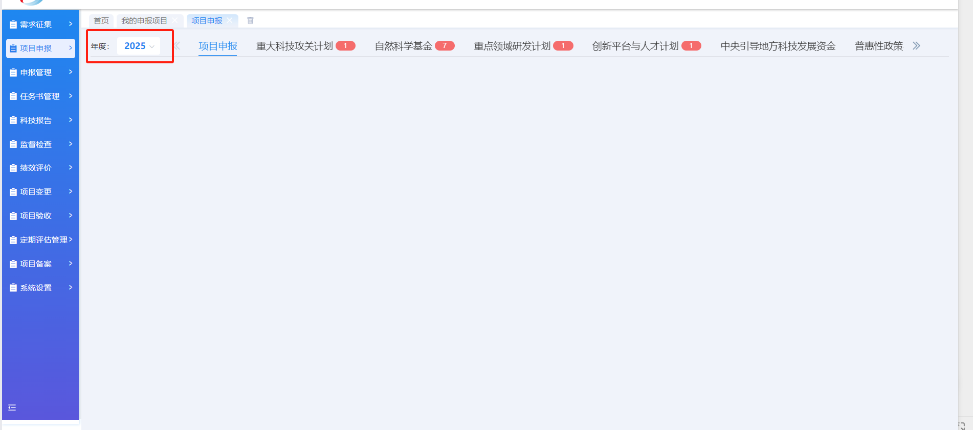 A: 菜单选择“项目申报”页面,“年度”中选择2025。
