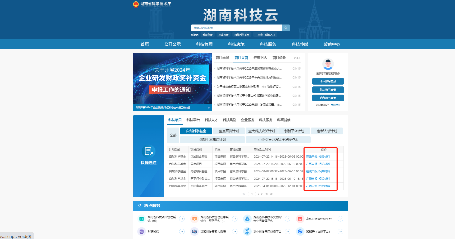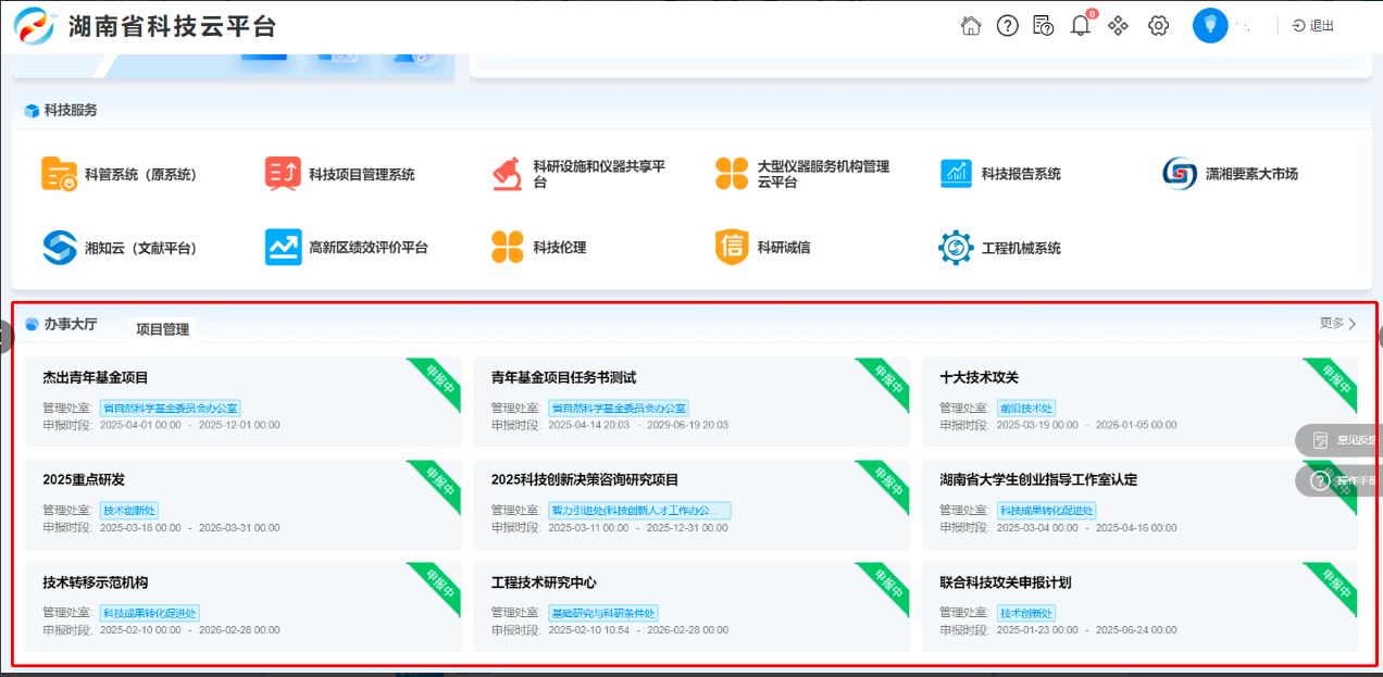 2. 第二种方式:个人账号登录“湖南科技云平台”,使用办事大厅的快捷申报菜单进行申报。