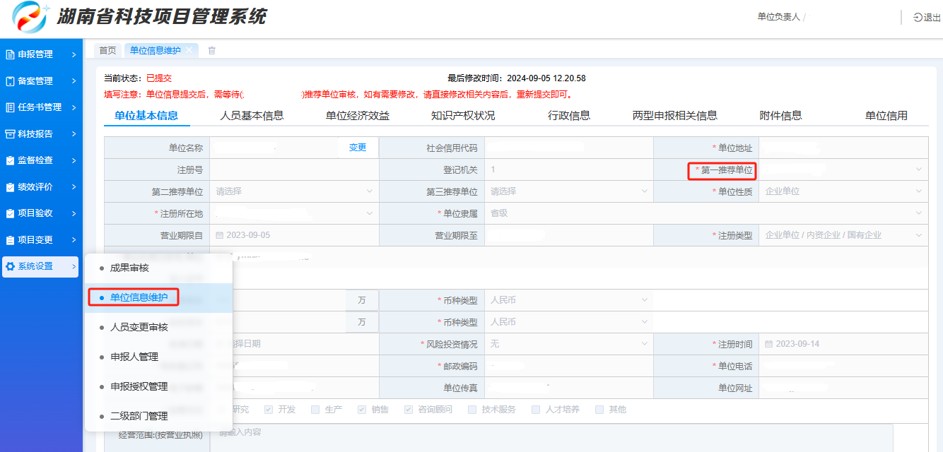 A: 使用单位账号进入科技项目管理系统→系统设置→企业信息维护,重新修改第一推荐单位,修改后提交,联系修改后的推荐单位审核通过即可。若无法点击第一推荐单位进行相关操作,则下滑点击"撤回"即可修改第一推荐单位。