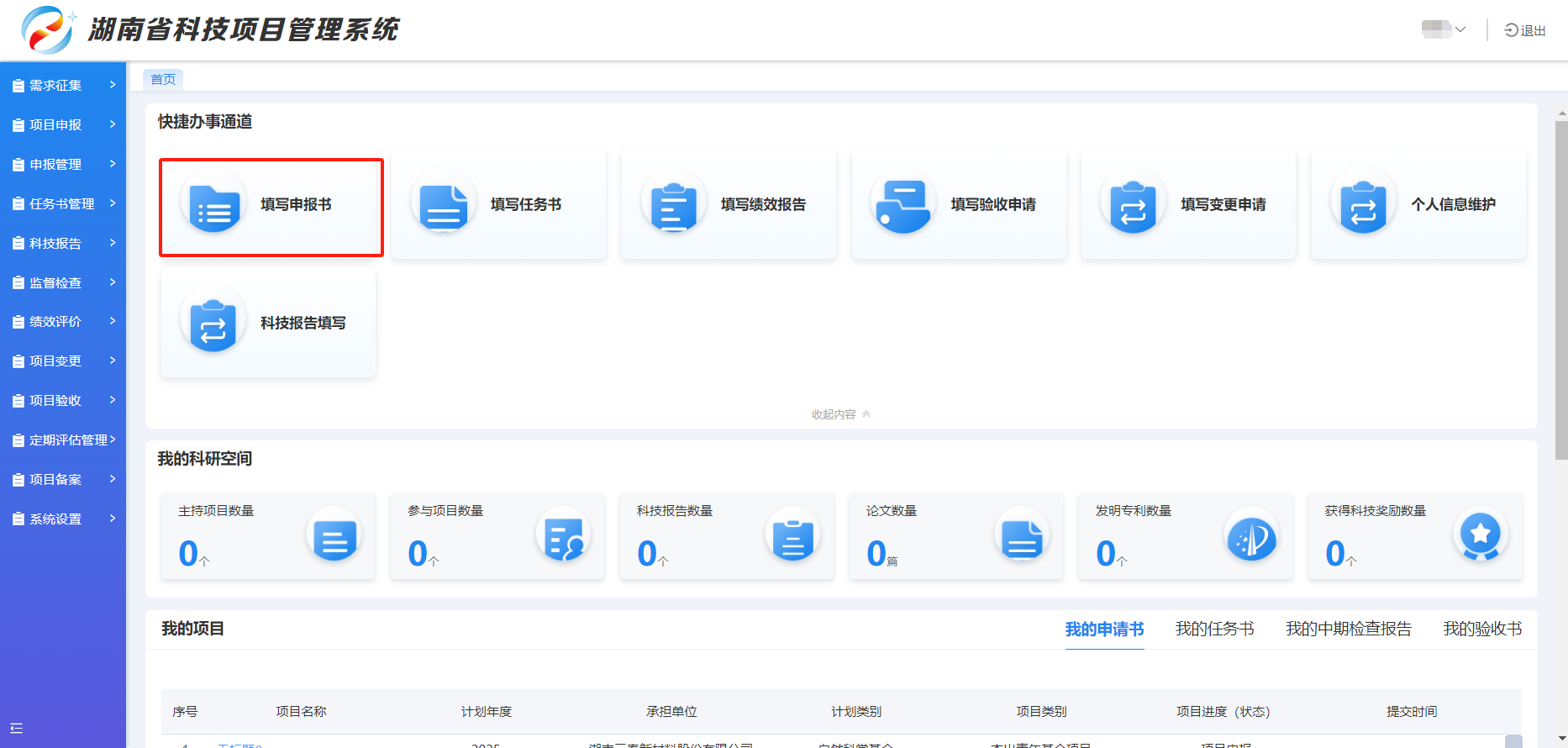 3. 第三种方式:个人账号登录“湖南科技云平台-科技项目管理系统”,使用快捷菜单“填写申报书”进行选择具体项目类别进行申报。